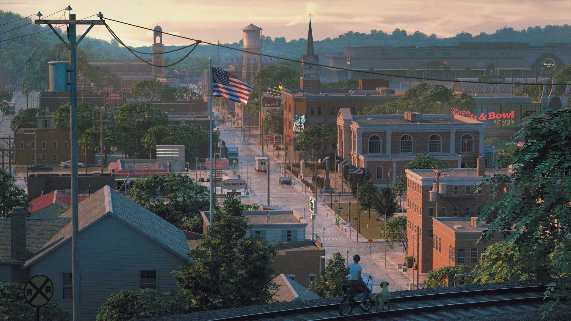 Explore the zeitgeist of the American heartland in a post-war landscape with quintessential models of the suburbs and traditional downtown areas. Kitschy bowling alleys and theaters, public buildings such as libraries and memorial buildings, mobile homes and tract housing, and even a shopping mall capture the nostalgia and stories of an idyllic American town in a time between the struggles of war and before the crush of technology.